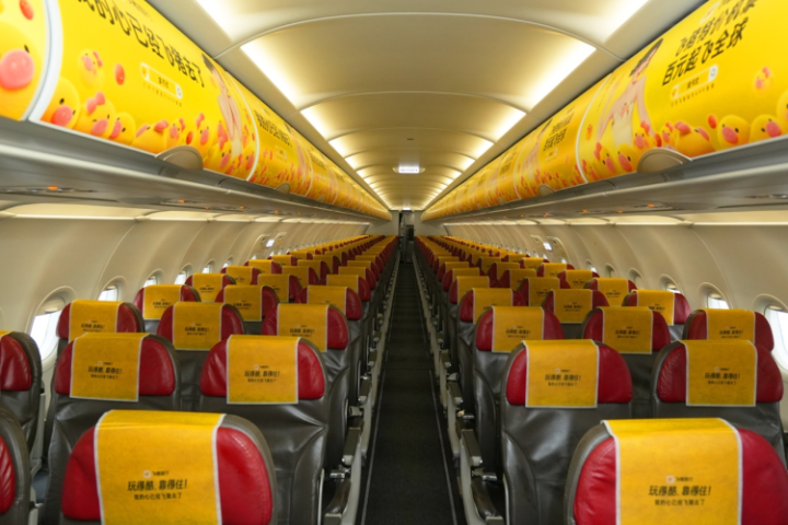 “飞猪号”机舱内部也做了特别布置,行李舱盖板、小桌板、座椅头巾等印着“舒心出行”等主题内容。当天下午,浙江长龙航空还在萧山国际机场T3航站楼的值机柜台、登机口设置了飞猪主题展示,此外,4月24日、5月1日当天,乘坐浙江长龙航空国内航班的旅客还有机会在值机柜台打印限量版飞猪代言人登机牌。